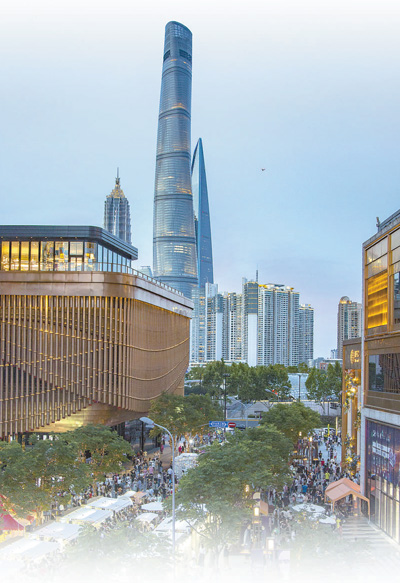 上海外滩金融中心枫泾路周末步行街景色。