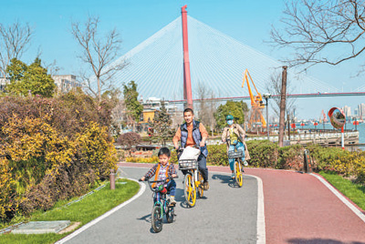 市民在杨浦滨江单车骑行道上骑行健身。