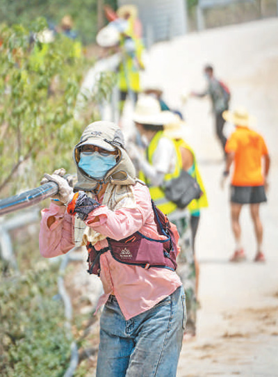 气温超过40摄氏度,火辣辣的太阳下,摩托车手们背篓里装着近50斤的物资,一趟趟重复着单程30分钟的陡峭山路。汗水夹杂着灰尘流下……现场随时能看到100多辆摩托车在飞奔,最多时有2000名志愿者同时在场。