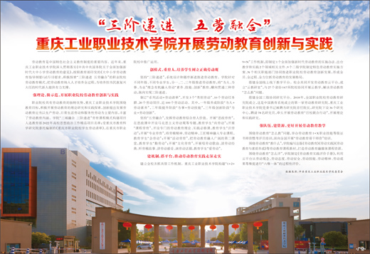 劳动教育是中国特色社会主义教育制度的重要内容。近年来,重庆工业职业技术学院深入贯彻落实《中共中央国务院关于全面加强新时代大中小学劳动教育的意见》,按照教育部印发的《大中小学劳动教育指导纲要(试行)》要求,积极探索“三阶递进 五劳融合”的职业院校劳动教育模式,把劳动教育纳入人才培养全过程,为培养担当民族复兴大任的时代新人提供有力支撑。