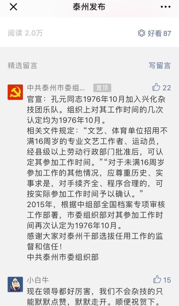 泰州市委组织部表示,2015年,根据中组部全国档案专项审核工作部署,泰州市委组织部对孔元参加工作时间“再次认定为1976年10月”。