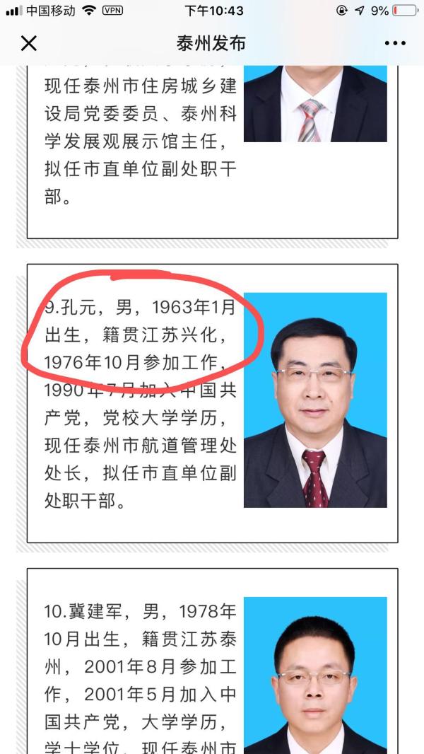 孔元,现任泰州市航道管理处处长,拟任泰州市市直单位副处职干部。