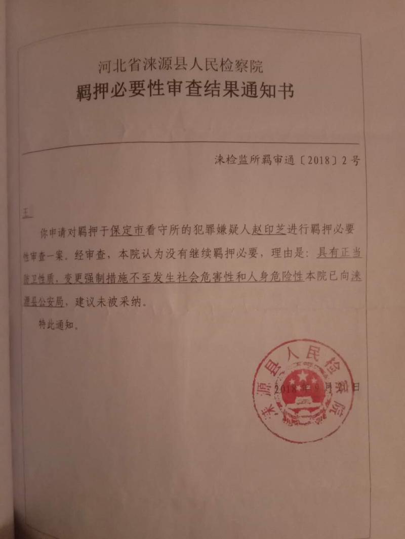 小菲告诉记者,家里向当地司法局申请了法律援助,向检察院提交父母取保候审的申请,涞源县人民检察院也向来源警方发出《对犯罪嫌疑人、被告人变更强制措施(予以释放)建议书》。检察院认为不需要继续羁押赵印芝,因其行为具有正当防卫性质,变更强制措施不至发生社会危害性和人身危险性。
