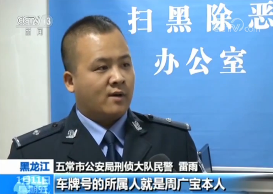 五常市公安局刑侦大队民警 雷雨:发现了这个嫌疑车辆车牌号,我们找到了,但是车牌号很不清楚,我们通过信息研判,把车牌号确定了,结果跟系统一比对,车牌号的所属人就是周广宝本人。