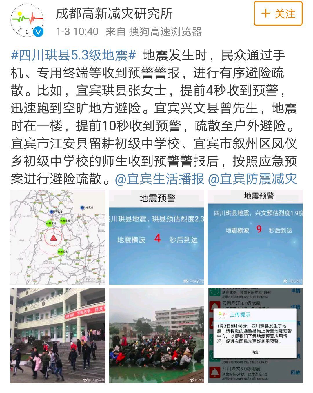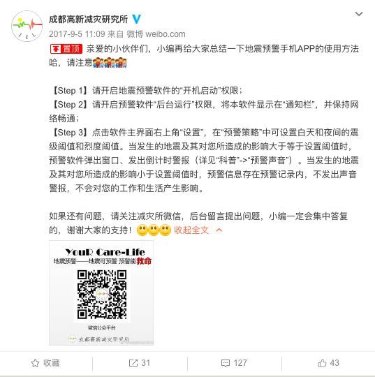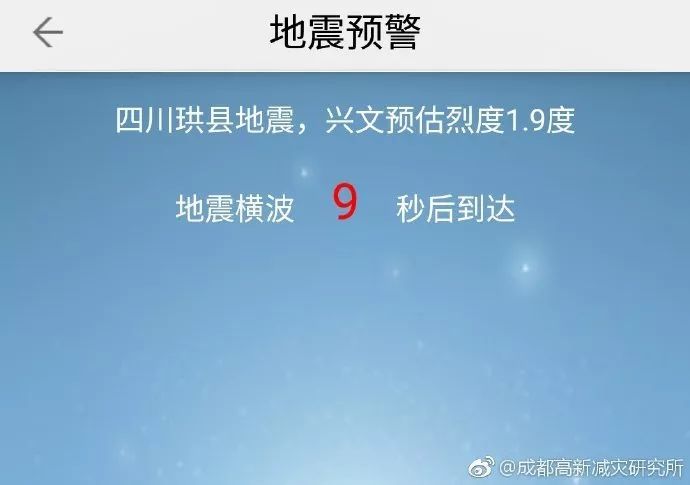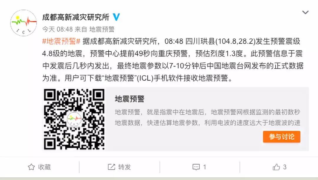 另据成都高新减灾研究所微博,预警中心提前向重庆预警,此预警信息于震中发震后几秒内发出。
