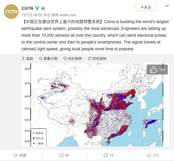 中国国际电视台官方微博1月1日发布的消息称,中国正在建设世界上最大的地震预警系统。