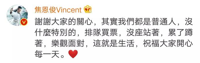 焦恩俊还发文称:其实我们都是普通人,没什么特别的,排队买票,没座站着,累了蹲着,乐观面对,这就是生活,祝福大家开心每一天。