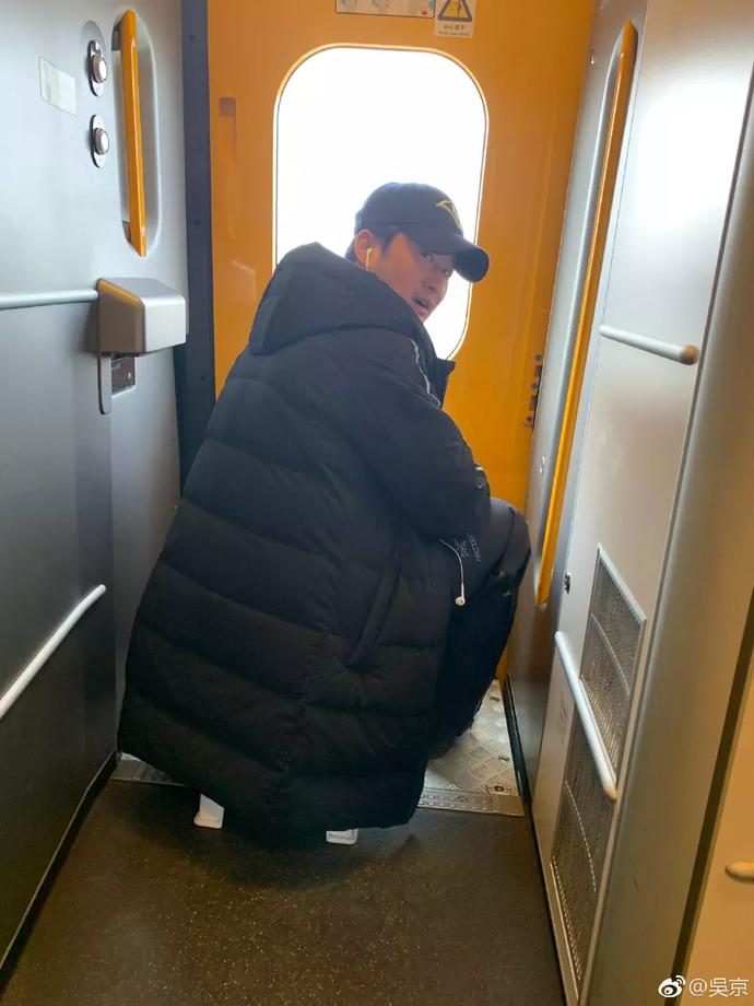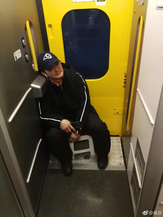 记者注意到,除了吴京,演员焦恩俊也曾没有买到过座位票,蹲坐在车厢过道角落。