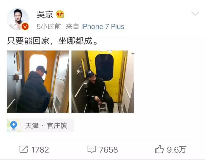 今天,演员吴京在微博上晒出两张“在火车过道坐着小板凳”的照片,配文称:“只要能回家,坐哪都成。”