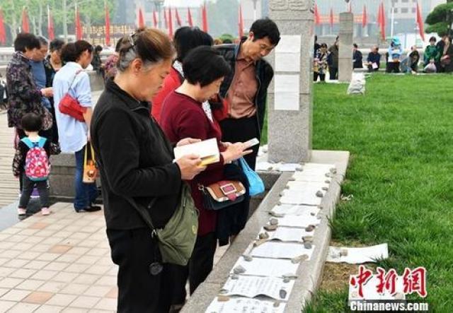 ↑资料图:河北石家庄相亲广场,父母正在帮孩子看征婚信息。中新社记者 翟羽佳 摄