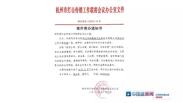节目播出后,引起了省市有关部门高度视。2018年12月18日,浙江省打击传销工作联席会议办公室专门发函,责成温州、杭州两市打传办立即成立专案组,迅速组织执法力量,全面彻查节目反映的问题,依法作出处置。