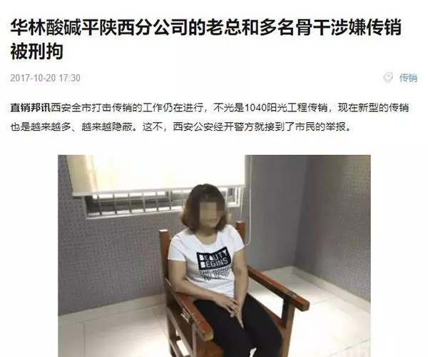 事实上,早在此次媒体曝光之前,华林酸碱平公司就曾陷入“传销”风波。2017年9月,有媒体报道华林酸碱平公司在陕西西安涉嫌传销被公安机关查处,华林酸碱平公司陕西分公司老总与多名骨干被西安市经开分局刑拘。民警介绍,当事人以生物理疗为掩饰、发展下线拉人头,实为变相的新型传销模式。