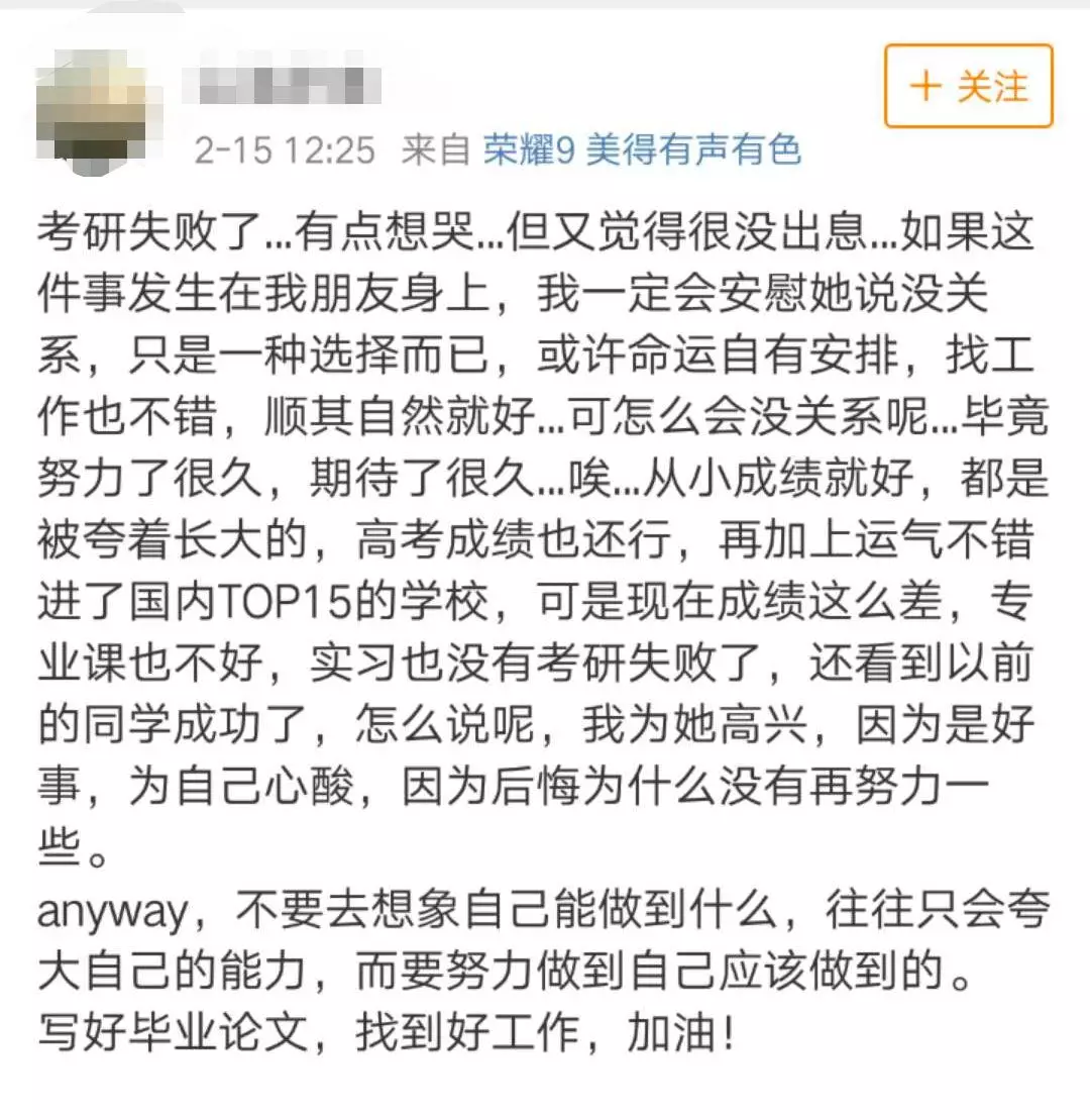 有人说你失败了。我失败了吗,承认失败多容易啊,比那种日复一日的坚持跟忍耐容易多了,但是我不服气,四年之后考研我又考回北大了,所以说一个人他一辈子不做任何尝试,他不做任何冒险的事,他也不为任何事情努力,他永远都不会失败,他都没有资格遭遇失败。但是你不同,你做过梦,你发过“疯”,你哭过、笑过、奋斗过,你爱过、恨过,你也后悔过,于是啊,芸芸众生中那么那么普通的一个你却拼尽全力活出最好的自己,又有谁有资格说你的人生不成功。