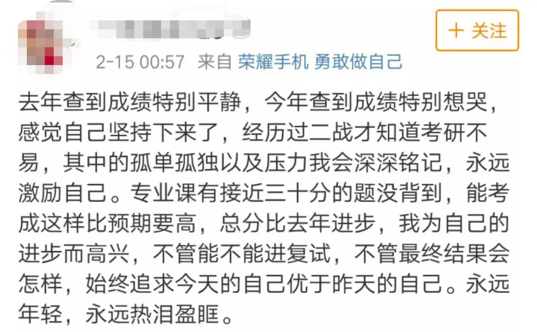 还有“二战”的考生深知考研的不易,去年查成绩很平静,今年却特别想哭,为自己进步而高兴。无论结果如何,始终追求今天的自己优于昨天的自己↓↓↓