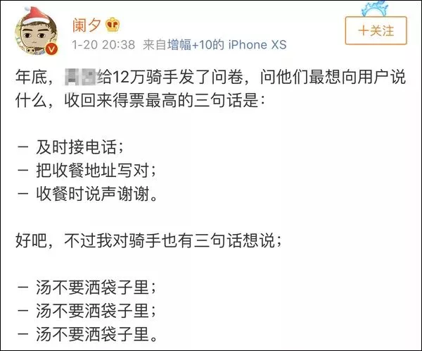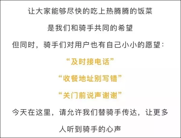 近日,一位ID为“阑夕”的微博网友发文表示,2018年某外卖平台的骑手们,最想对客户们说的三句话是“及时接电话;把收餐地址写对;收餐时说声谢谢”。