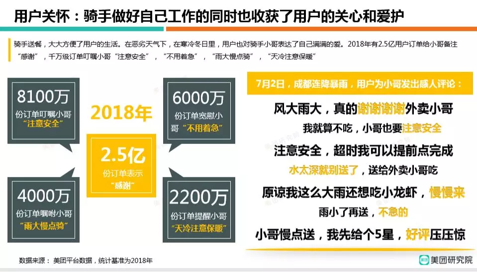 根据美团《2018外卖骑手就业报告》,2018年用户为骑手写下了3亿好评、2.5亿感谢。