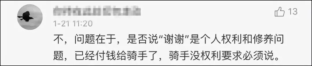 还有人认为自己是消费者,付费购买服务,外卖员拿工资提供服务,两者是平等的交易关系,凭什幺要给外卖员表示感谢呢?