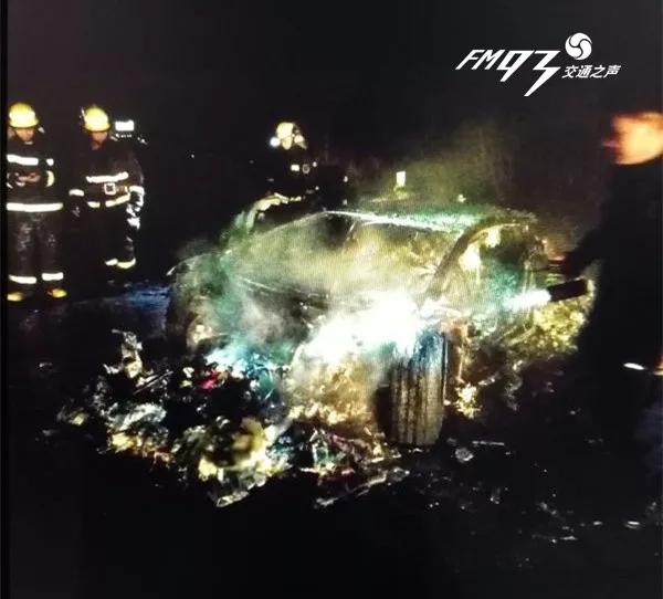 正在附近执勤的高速民警接到指令后火速赶往事故现场,在硬路肩和慢速车道之间有辆小车正在熊熊燃烧,浓烟滚滚不时还有炸裂声。