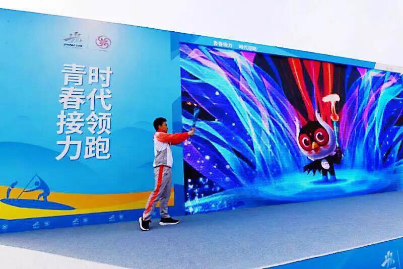最后一棒火炬手李政点燃吉祥物“青青”手中的火炬