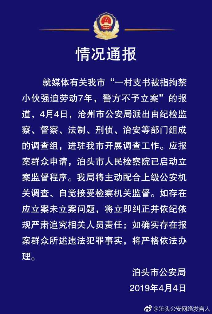 据泊头市公安局微博消息,针对媒体报道的“一村支书被指拘禁小伙强迫劳动7年,警方不予立案”一事,沧州市公安局组成调查组,进驻泊头市开展调查工作。