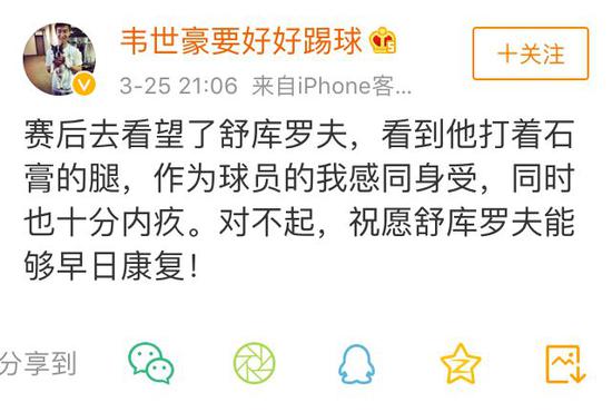 今晚(3月25日)9时许,韦世豪本人也在微博上对舒库罗夫说了“对不起”,并祝舒库罗夫早日康复。↓