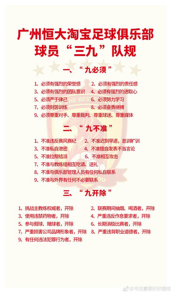环环发现,韦世豪曾在2月26日的微博上亮出他所在的恒大俱乐部的“三九”队规。按此队规,有网友猜测,韦世豪的这次恶意犯规将招来恒大俱乐部的重罚。