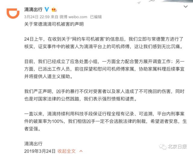 关于常德滴滴司机被害的声明