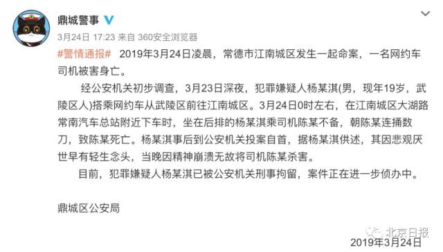 3月24日傍晚,湖南省常德市鼎城区公安局官方微博@鼎城警事发布情况通报:3月24日凌晨,常德市江南城区发生一起命案,一名网约车司机被害身亡。