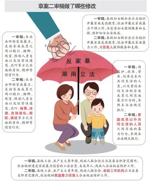 会议审议了《湖南省实施〈中华人民共和国反家庭暴力法〉办法(草案)》二审稿。记者注意到,草案二审稿做出了多处修改。
