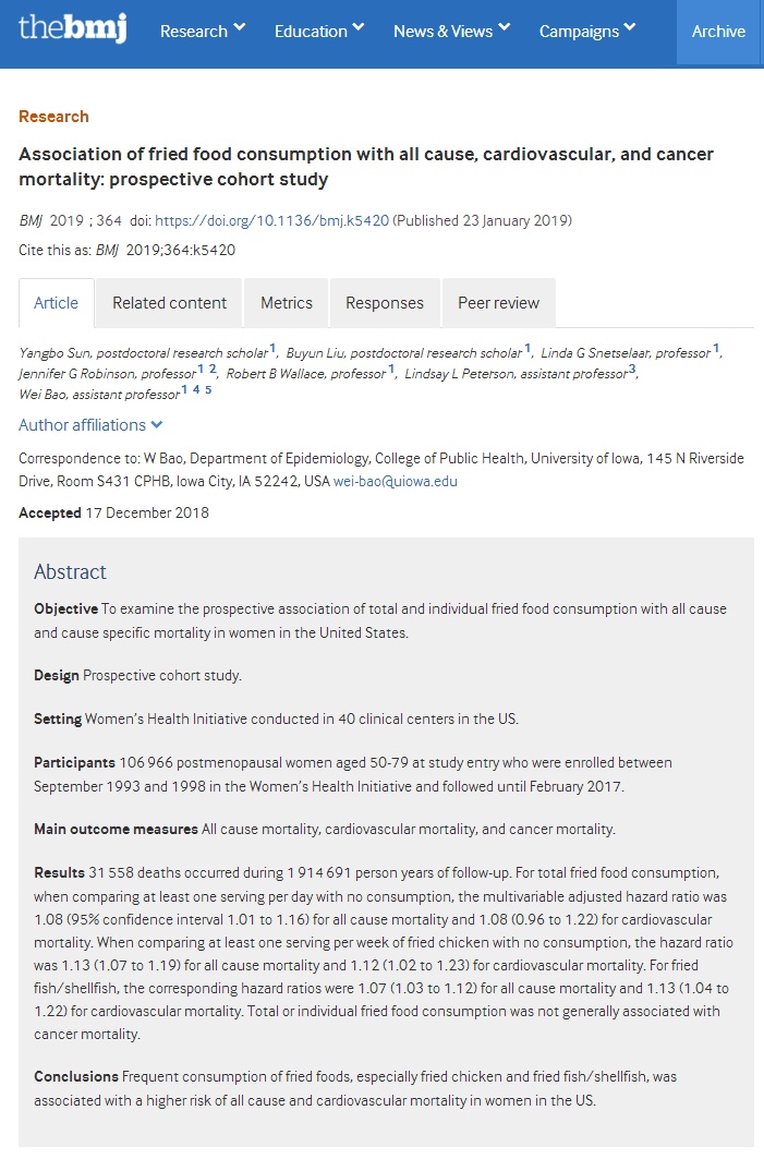 近日,发表在《英国医学杂志(BMJ)》上的一项最新分析表明,经常吃油炸食品,特别是炸鸡或炸鱼的人,全因死亡和心血管死亡的风险均显著升高。