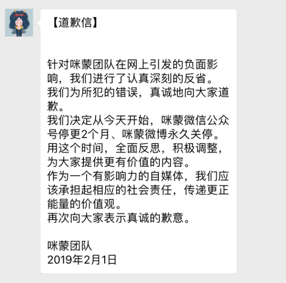 上个月底,咪蒙旗下的“才华有限青年”发布《寒门状元之死》一文,因为虚构细节,引发广泛争议,咪蒙也成为矛头所指。面对舆论压力,春节前,咪蒙曾发公开信称:因咪蒙团队引发的负面影响,咪蒙微信公众号停更2个月、咪蒙微博永久关停。