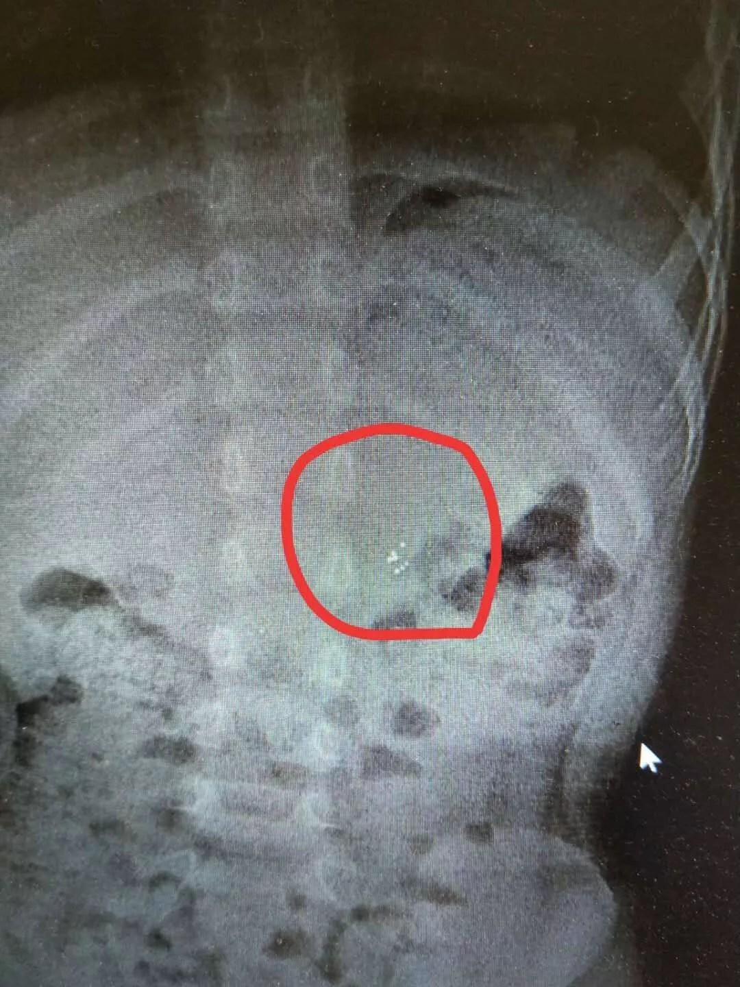 陈医生让吴女士先带孩子去拍了腹部立位平片。很快,片子出来了,果然,在孩子胃里,水银聚集在那里,看上去晶莹剔透。