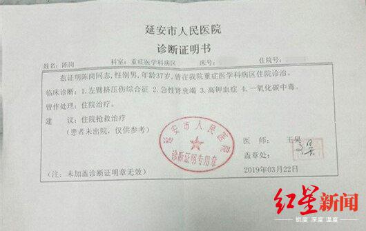 陈岗由于一氧化碳中毒,再加上左胳膊长时间在身体下面压迫导致:急性肾衰竭,挤压综合征,电解质紊乱,钾离子高,一直生命垂危在重症监护室抢救中,医院下了好几次病危通知书。杨红燕的情况比丈夫稍微好一点,还能看到一点希望。