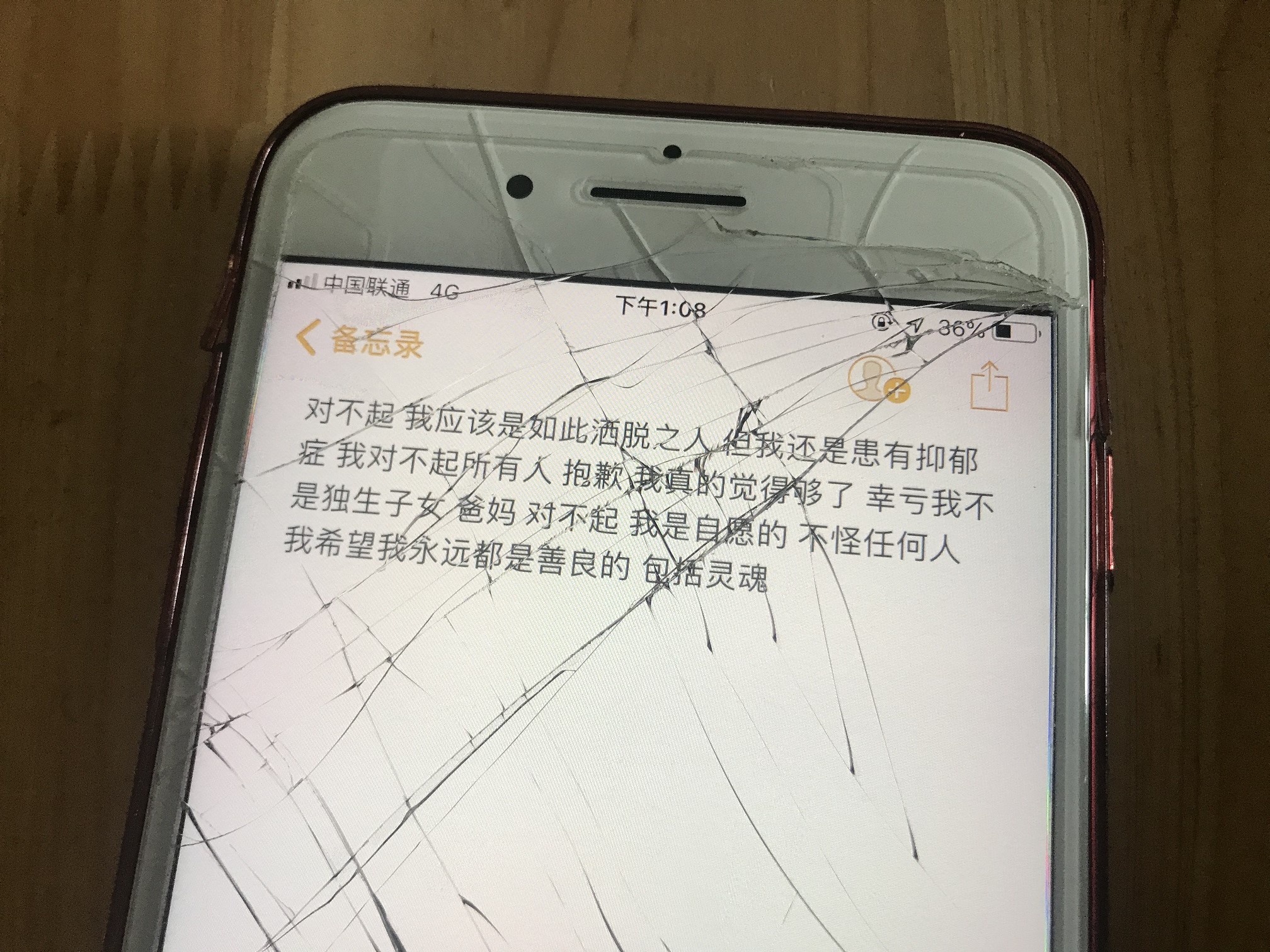 留在家里的手机备忘录里,有一段她去世前写下的文字:“对不起,我应该是如此洒脱之人,但我还是患有抑郁症。我对不起所有人,抱歉,我真的觉得够了,幸亏我不是独生子女。爸妈,对不起,我是自愿的,不怪任何人。我希望我永远都是善良的,包括灵魂。”