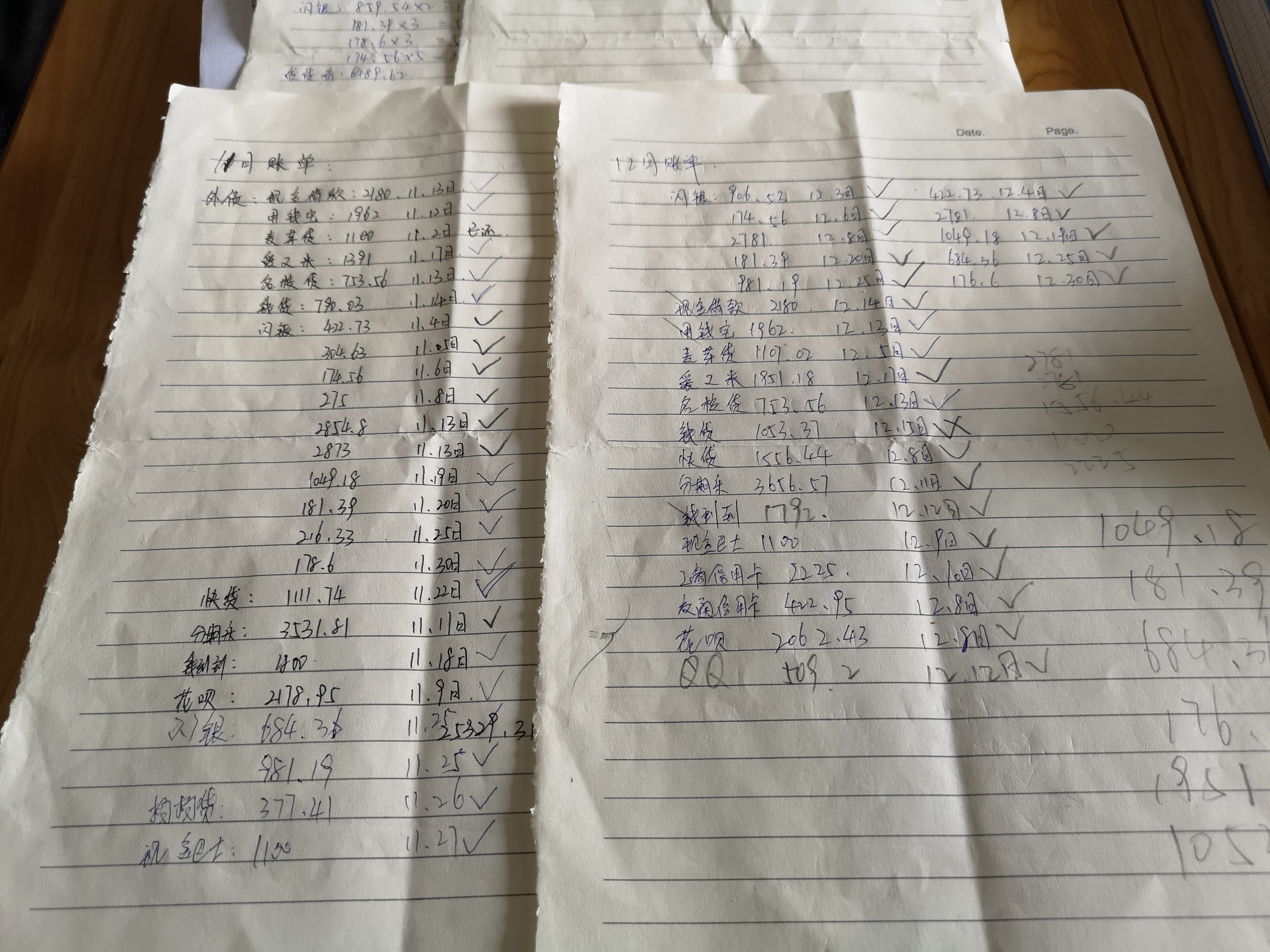 醒来后,他开始整理女儿的遗物。在一本书里,冯远发现了三张从笔记本上撕下来的纸,标题分别是11月账单、12月账单。账单上,密密麻麻地写着分期乐、闪银、爱又米等网贷机构的名称、还款金额和还款日期。12月,冯洁要还的总额是31489.25元,单闪银一家,就要还10138.5元。