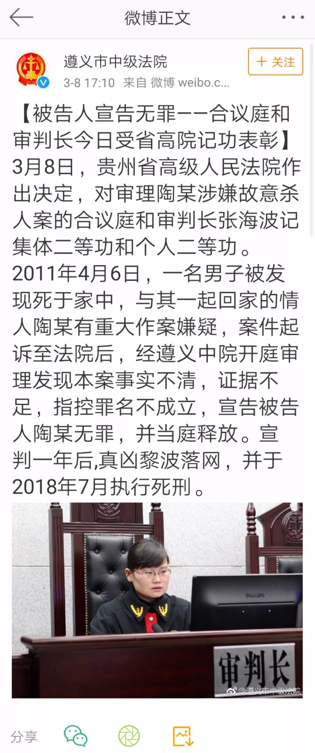 2019年3月8日,贵州省高级人民法院作出记功决定,为遵义市中级人民法院陶某涉嫌故意杀人案件合议庭和主审法官张海波分别记集体二等功和个人二等功。《决定》指出,合议庭面对社会舆论压力和被害人亲属谩骂威胁,始终坚持疑罪从无、证据裁判原则,综合运用证据规则、日常经验逻辑等方法,严谨周密地审查判断全案事实、证据,杜绝了冤假错案发生,维护了司法权威。