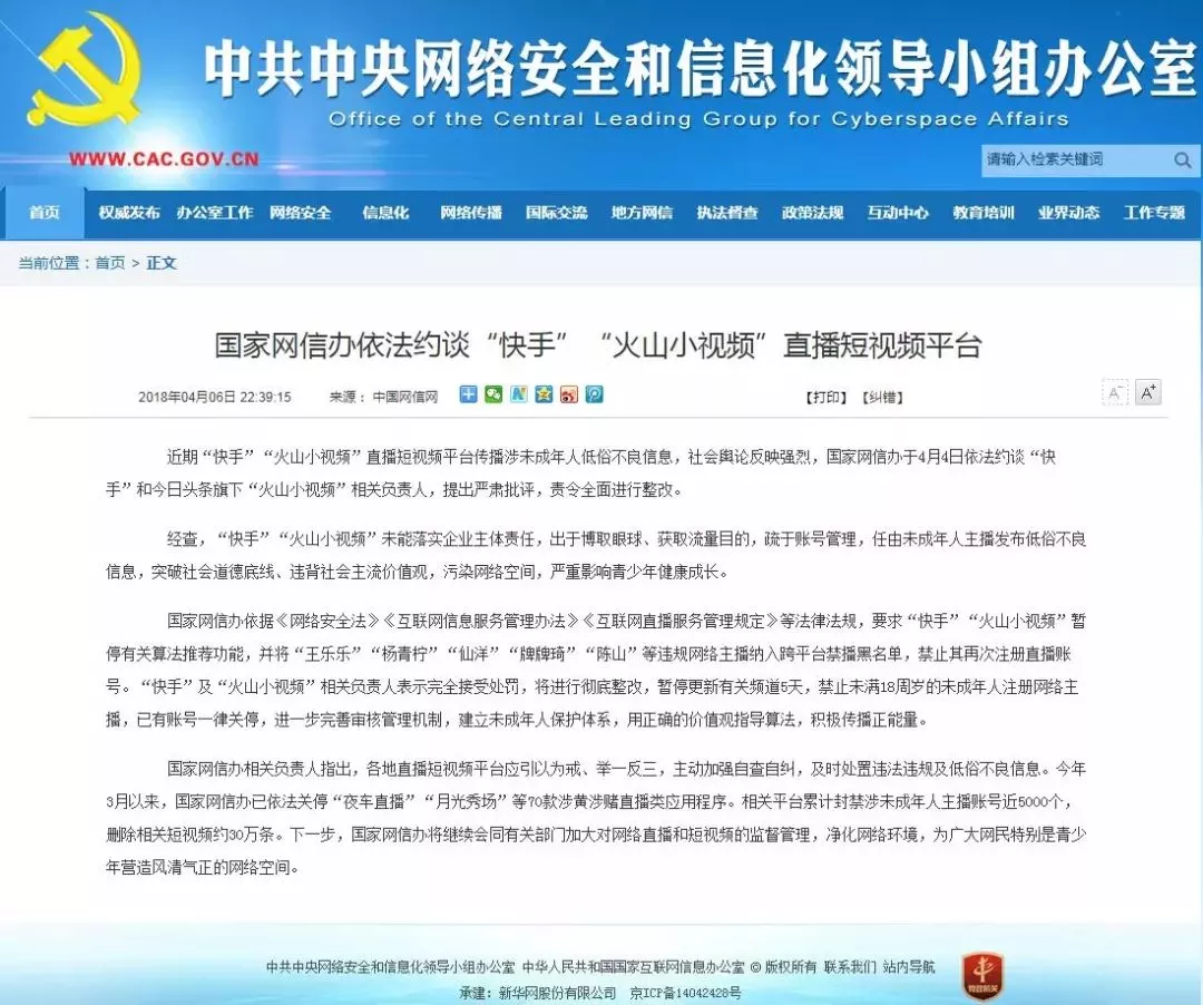 去年4月,国家网信办官方网站发布消息:针对“快手”“火山小视频”平台上传播涉未成年人的低俗不良信息,国家网信办对这两个平台进行了约谈,并要求其进行整改。