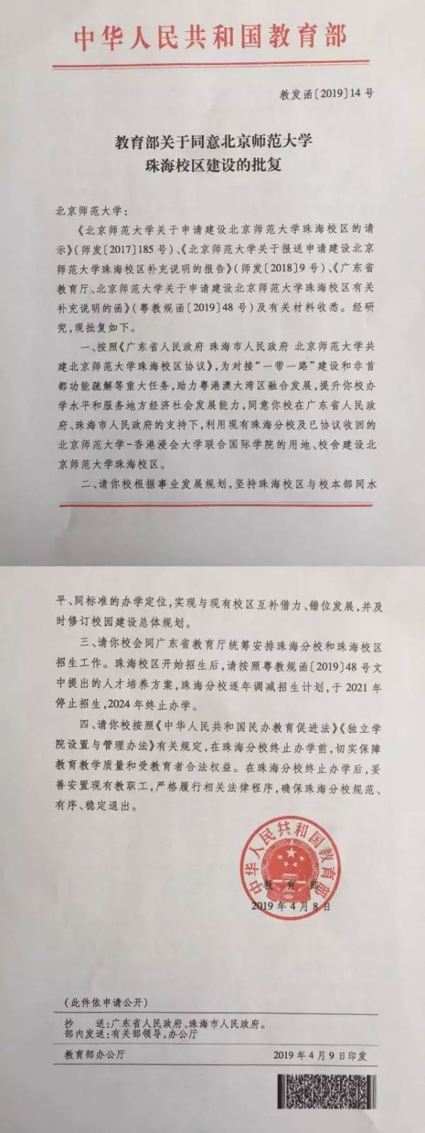 今年4月,教育部发布《关于同意北京师范大学珠海校区建设的批复》。