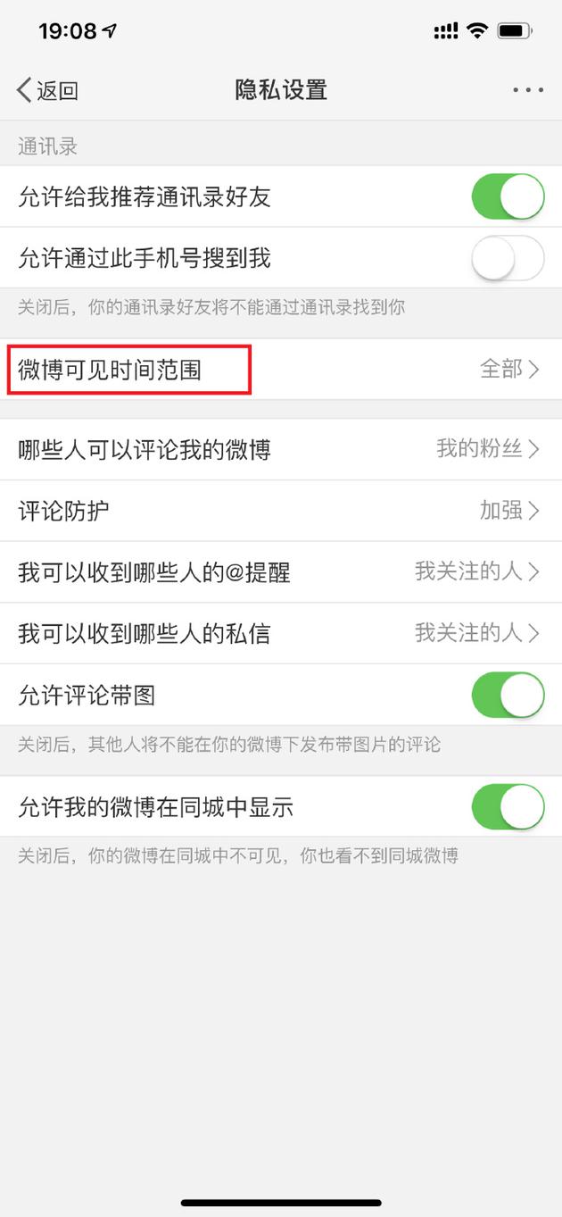 在微博客户端-我-隐私设置-微博可见时间范围中,勾选全部,即可变为全部内容对用户可见。