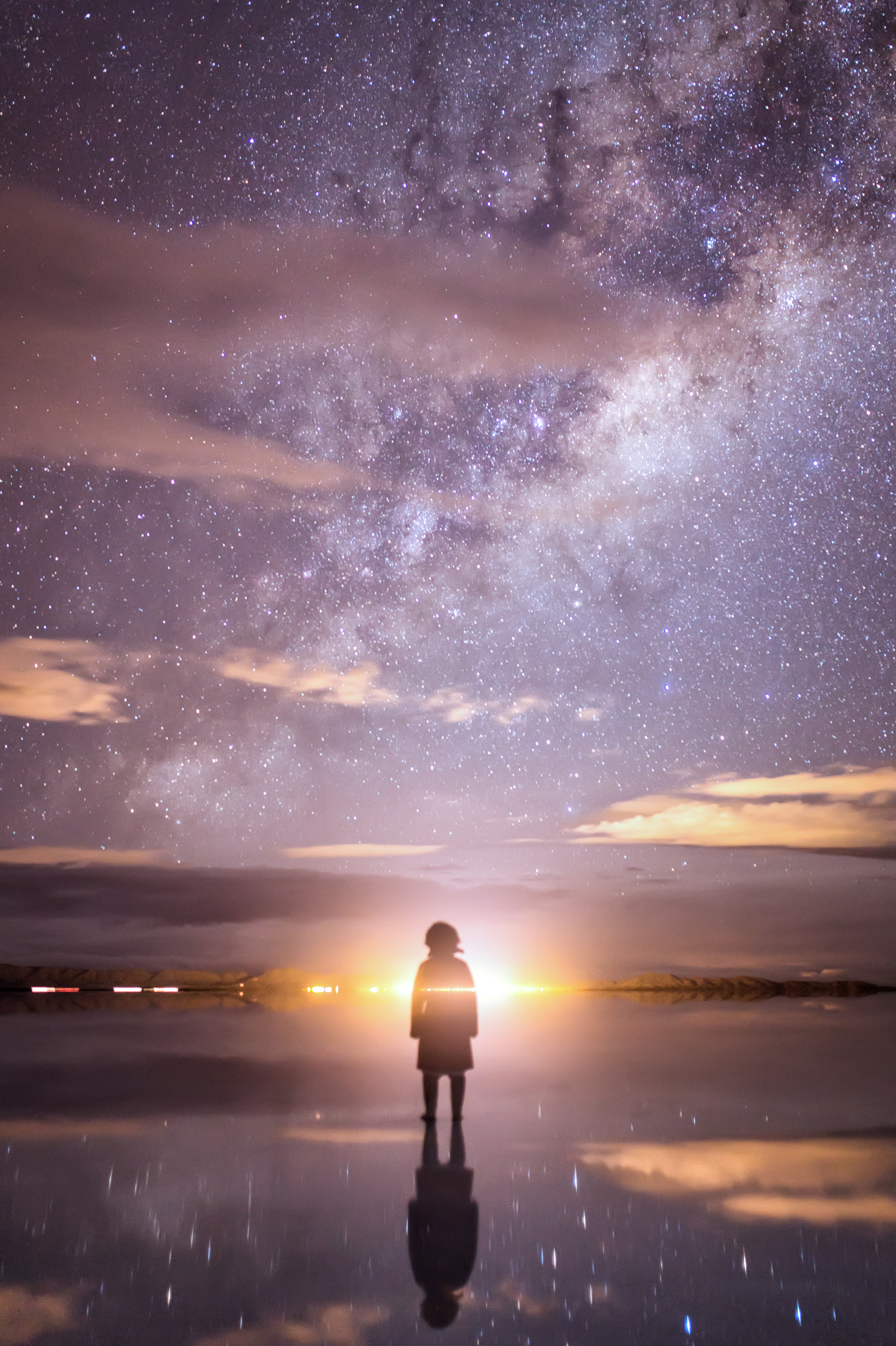 乌尤尼盐沼,可见远处的灯光和升起的银河 叶梓颐摄