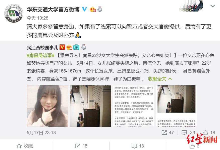 18日上午10时28分,@华东交通大学 转发上述寻人信息,并称“请大家多多留意身边,如果有了线索可以向警方或者交大官微提供,后续有了更多的消息会及时补充”。