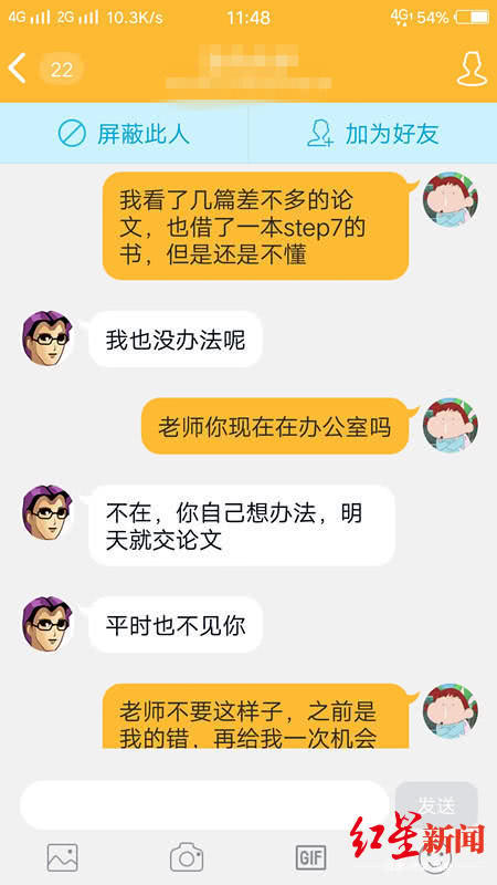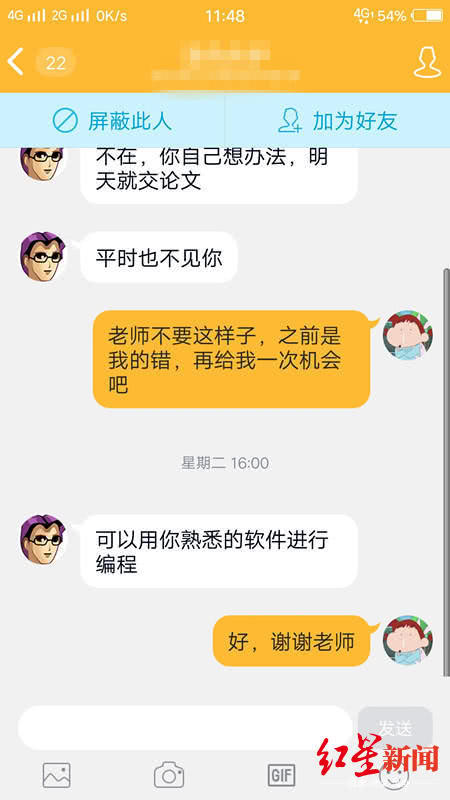 据其提供的聊天记录截图显示,当天小张发消息给其导师,请教设计实验装置编程程序以及相关问题,老师回复称, “你自己想办法,明天就交论文”,小张恳请老师再给一次机会,老师称, “可以用你熟悉的软件进行编程”,时间是14日16:00。