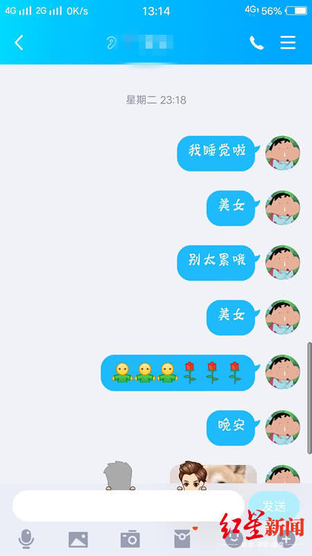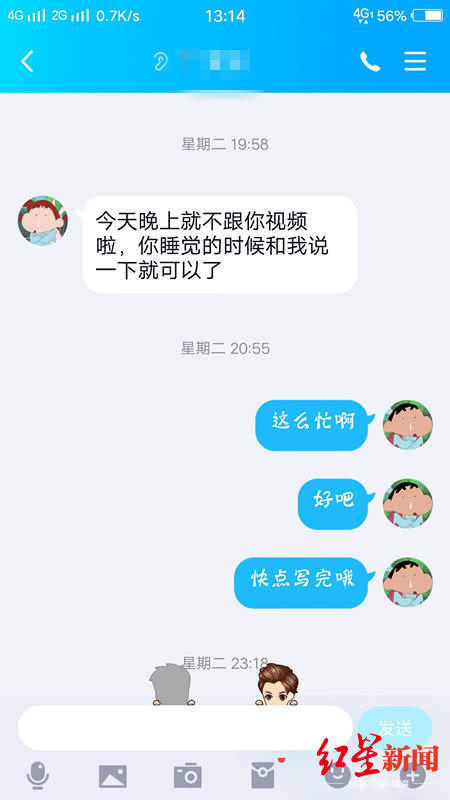 小张的男友小江告诉红星新闻记者,当天他一直和女友在QQ上有聊天。据其提供的聊天截图显示,14日18:16、18:23、19:23,小江给小张发消息,均收到回复。直到19:58分,小张发来消息说, “今天晚上就不跟你视频啦,你睡觉的时候跟我说一下就可以了”。