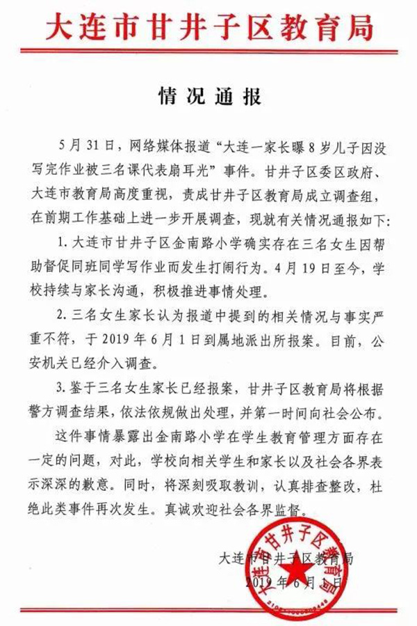 6月1日,针对网络媒体报道“大连一家长曝8岁儿子因没写完作业被三名课代表扇耳光”事件,大连市甘井子区教育局在其公众号回应称,确实存在三名女生因帮助督促同班同学写作业而发生打闹行为。三名女生家长认为报道中提到的相关情况与事实严重不符,已到派出所报案,目前公安机关已介入调查。