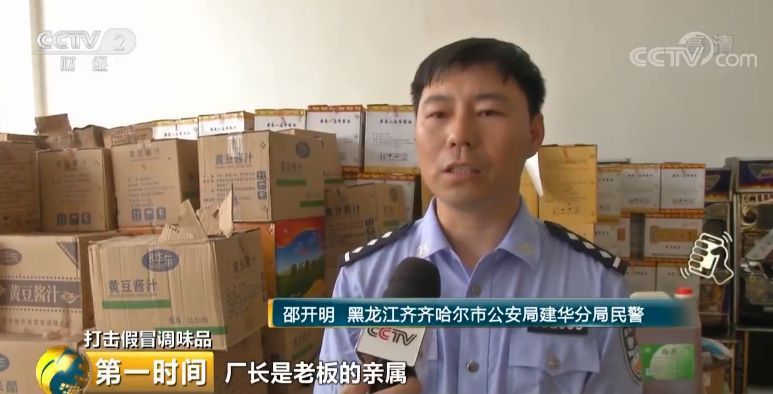 黑龙江齐齐哈尔市公安局建华分局民警 邵开明:对39个品类进行抽检,经过检验中心检测都是不合格产品,一箱酱油的成本,包装和箱子加原材料,成本在5、6元,非常低,但是可以卖到20、30元。