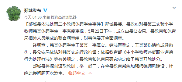 5月23日凌晨,山东郯城县新闻和网络管理办公室官方微博@郯城发布通报调查结果。“经调查,韩某体罚学生王某某一事属实。经法医鉴定,王某某伤情构成轻微伤,县公安局依法对韩某实施行政拘留;依据教育部《中小学教师违反职业道德行为处理办法》等有关规定,县教育和体育局研究决定给予韩某开除处分。”该通报称,郯城县将深刻汲取教训,举一反三,在全县教育系统加强师德师风建设,杜绝此类问题再次发生。