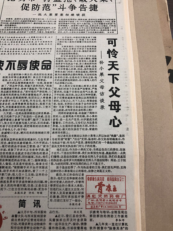 澎湃新闻还注意到,早在1997年12月9日,云南本地媒体曾刊发孙小果父母接受采访反思责任的报道。在这篇以《可怜天下父母心——孙小果父母访谈录》为题的文章中,孙父孙母对儿子的犯罪行为表示了震惊、愤慨和谴责。