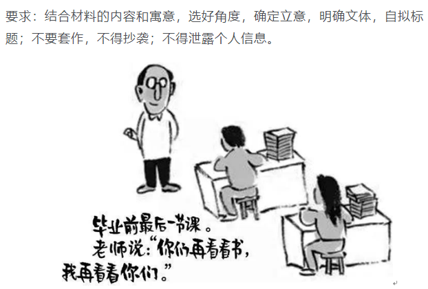 全国卷三作文题要求考生,根据漫画写一篇不少于800字的文章。漫画勾勒了“毕业前的最后一课”,老师说:“你们再看看书,我再看看你们。”