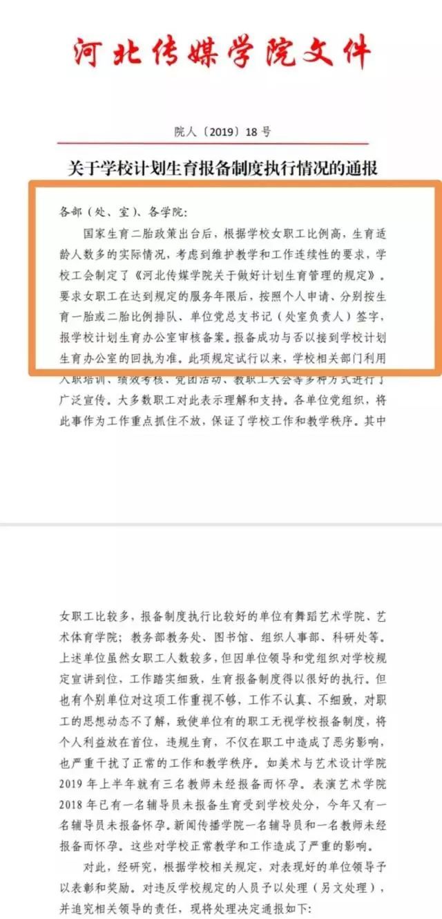 6月28日一早,河北传媒学院的教职员工通过工作微信群,收到了河北传媒学院院长办公室印发的《关于学校计划生育报备制度执行情况的通报》,以及对部分员工的处罚公告。《通告》指出,对未报备怀孕女职工进行“全校通报批评,扣发 6 个月绩效工资”,“取消两年内评优评先和评定职称”。