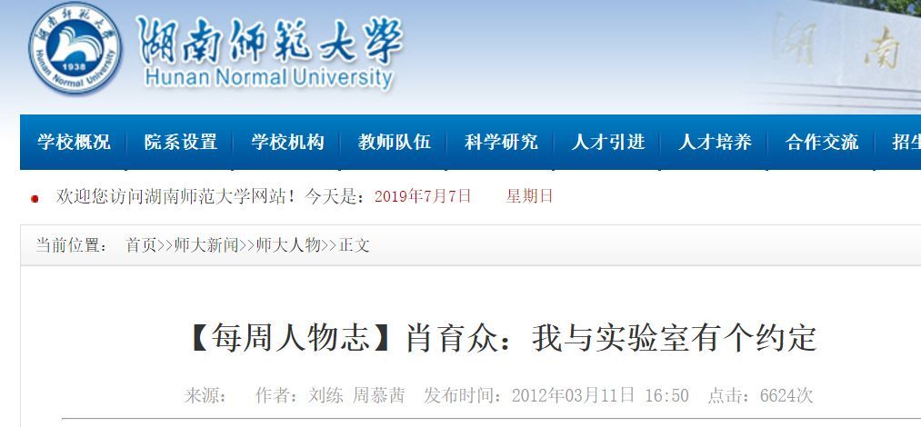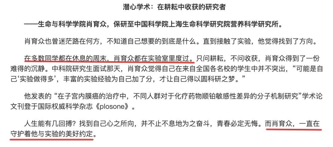 在湖南师范大学另一份《让榜样成为前行的力量》的报道中也写道:在多数同学都在休息的周末,肖育众都在实验室里度过。